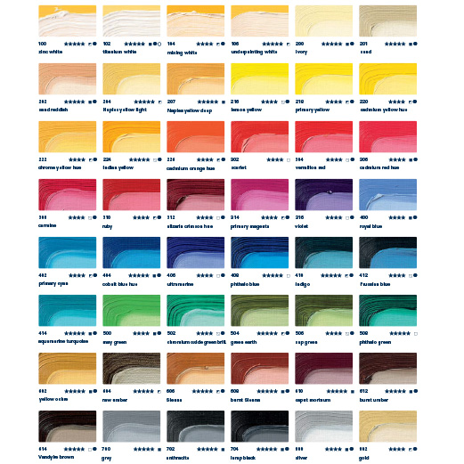 規格:條裝 48 色 60ml 、條裝 36 色(金、銀兩色)200ml 、罐裝 鈦白(Titanium white)500ml