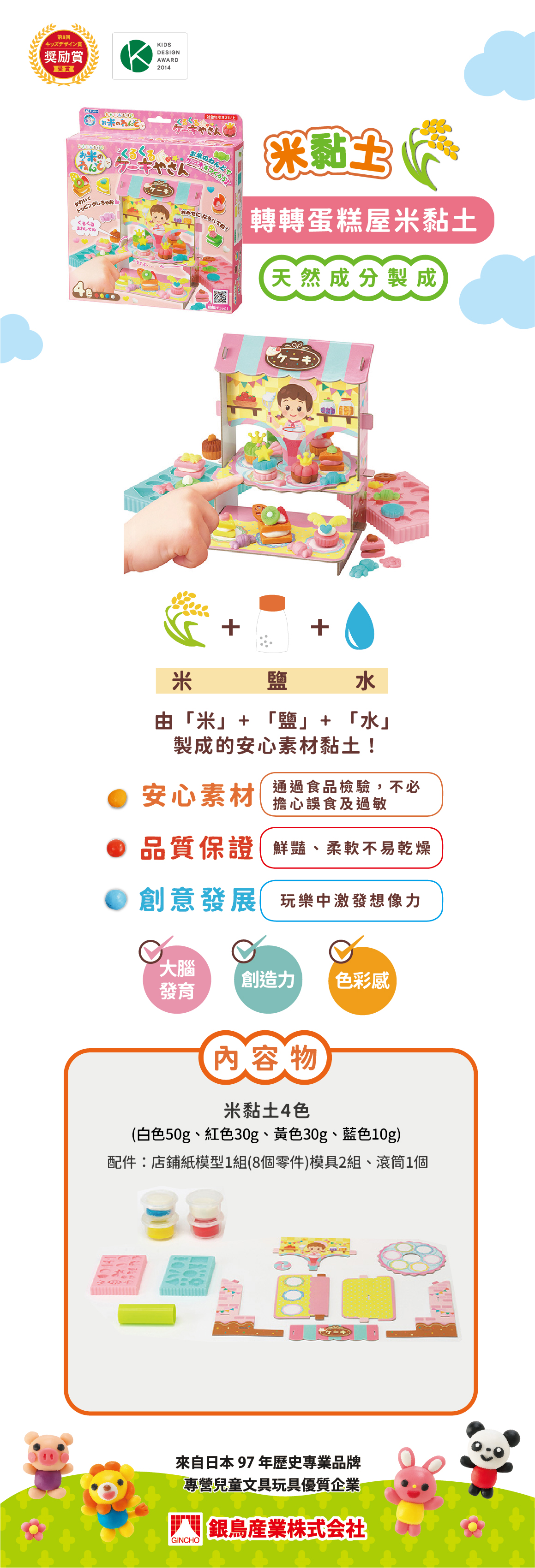 規格:米黏土4色(白色50g、紅色30g、黃色30g、藍色10g) 配件:店鋪紙模型1組(8個零件)模具2組、滾筒1個