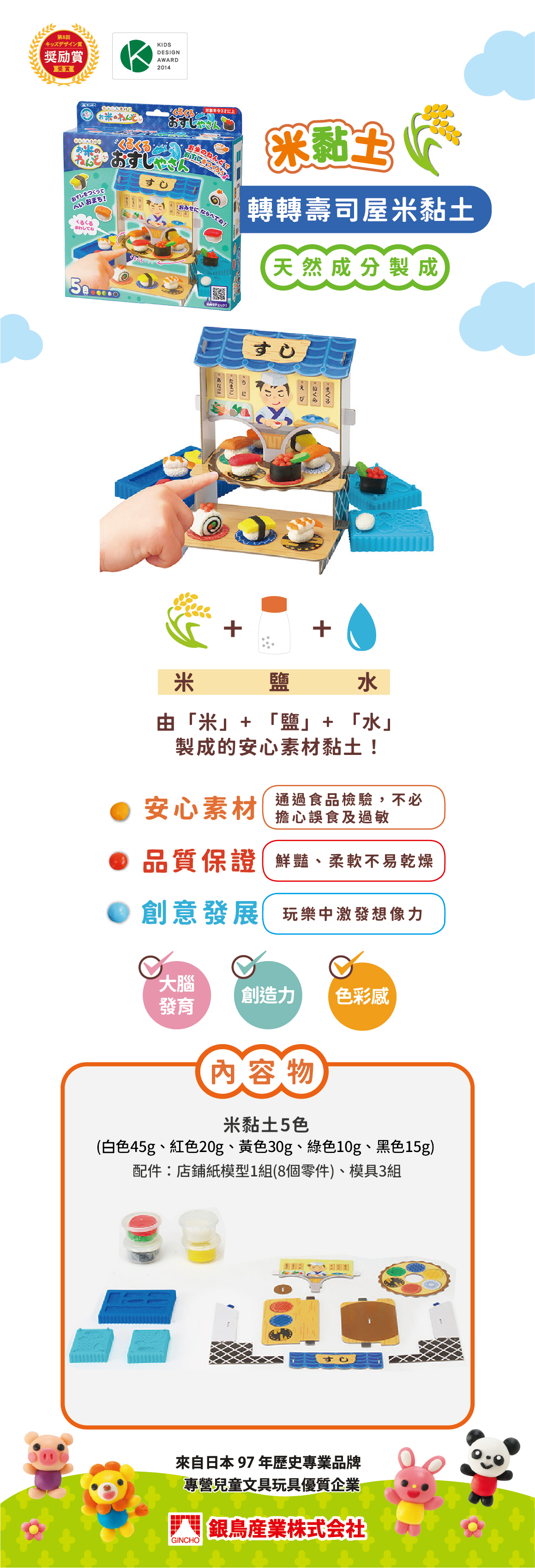 規格:米黏土5色(白色45g、紅色20g、黃色30g、綠色10g、黑色15g) 配件:店鋪紙模型1組(8個零件)、模具3組