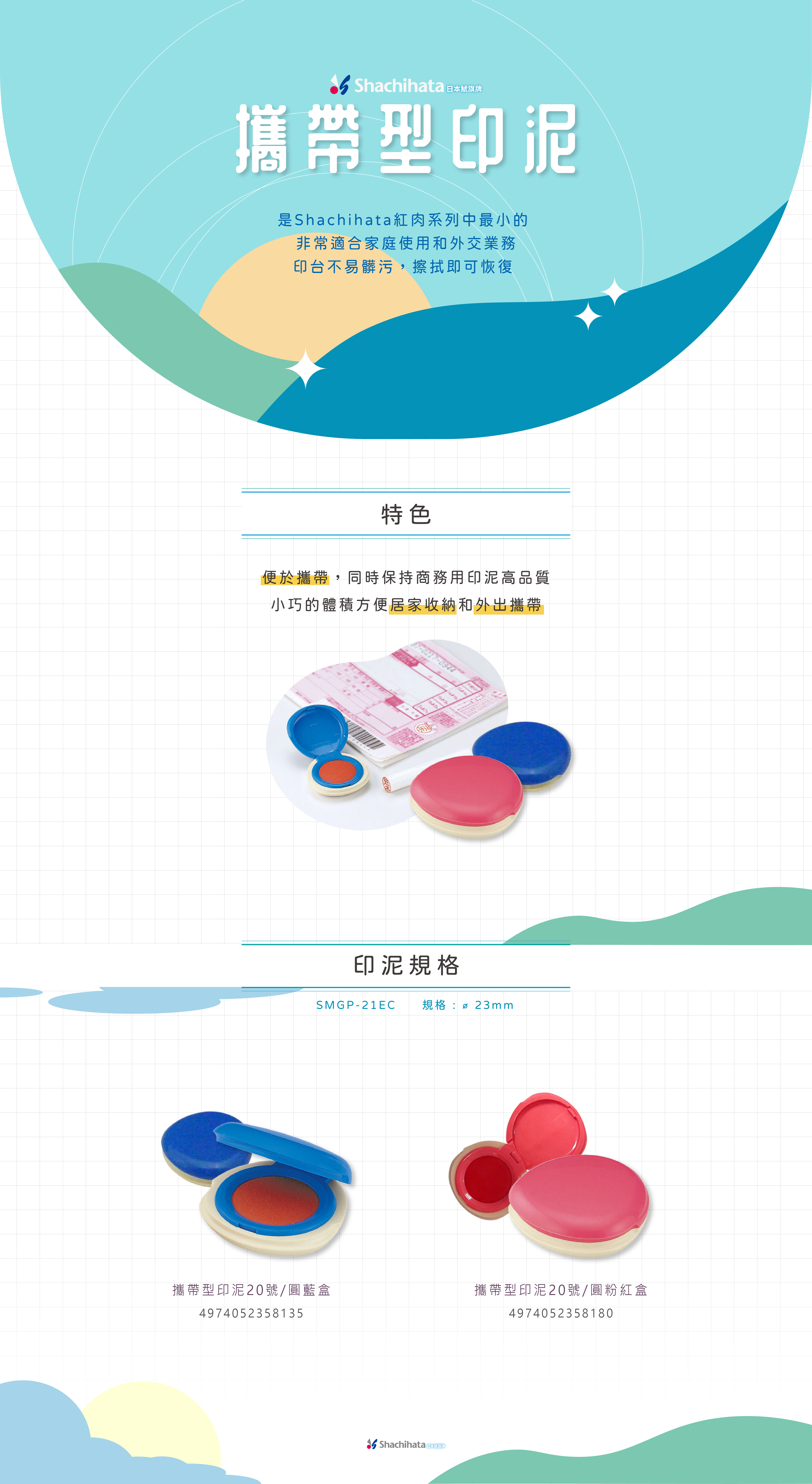 是Shachihata紅肉系列中最小的,常用註冊印章的最大尺寸和直徑為 18 毫米,它體積小,不佔空間,非常適合家庭使用和外交業務